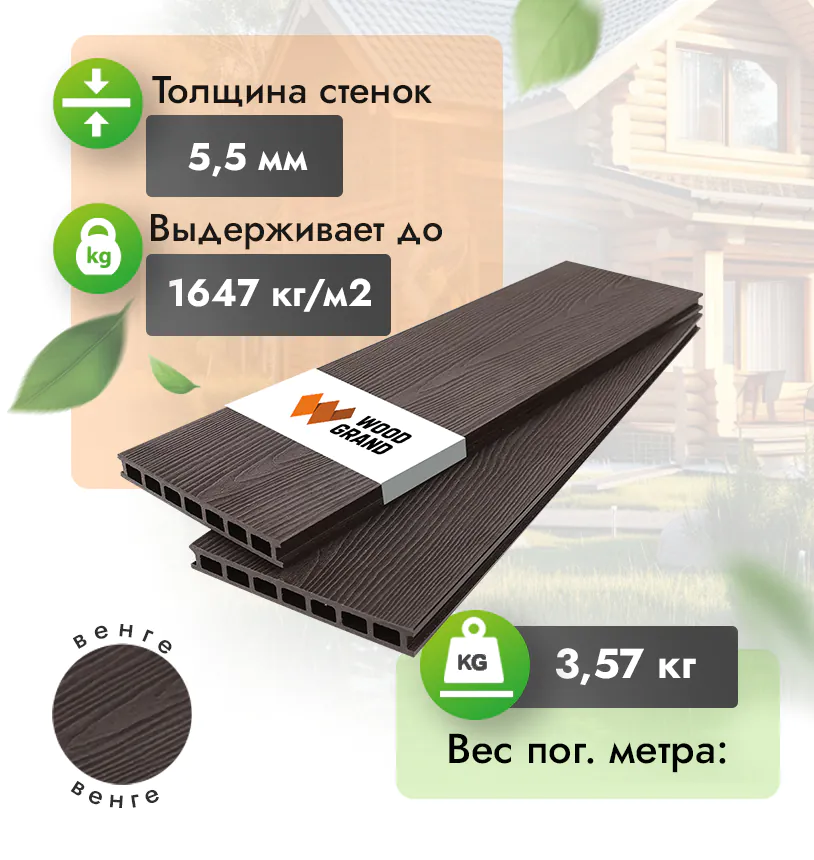 Наша террасная доска из ДПК выдерживает до 3318 кг/м2, влагостойкая, не требует ухода.